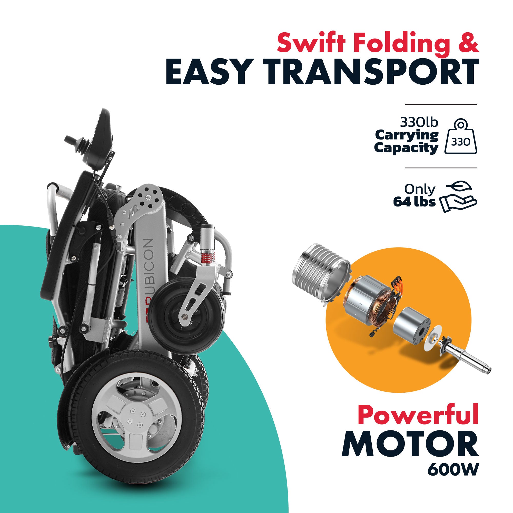 Unleash the pinnacle of comfort, style, and performance with the Rubicon DX12 Deluxe Foldable Electric Wheelchair. Designed in California with insights from thousands of mobility device users, it's the embodiment of form and function. With robust 300Wx2 Brushless Dual motors, it conquers various terrains effortlessly, even steep slopes. Powered by a high-quality Lithium-Ion battery, this chair boasts an impressive 30-mile range on a single charge, ensuring your day-long adventures are uninterrupted. In just 3 seconds, it folds into a compact 13-inch height, perfect for storing in compact car trunks. Crafted from high-strength aircraft-grade aluminum alloy with a weatherproof coating, it's ideal for outdoor use. Its 330 lbs weight capacity and a mere 64 lbs total weight strike the perfect balance between sturdiness and portability. Maneuvering through tight spaces is a breeze with its small 32-inch turning radius, making indoor use a delight. The innovative 360-degree Joystick with ALL-Directions guarantees precise control even in confined areas. This all-terrain wonder boasts a mighty 600W motor, ready to conquer grass, ramps, sand, mud, snow, and bumpy roads. And with a 5-year frame warranty, along with 1 year for the motor and joystick controller, plus 6 months for the battery, you're assured of mobility, style, and unparalleled peace of mind. Experience a new level of mobility and independence with the Rubicon DX12 - your ultimate deluxe foldable electric wheelchair.